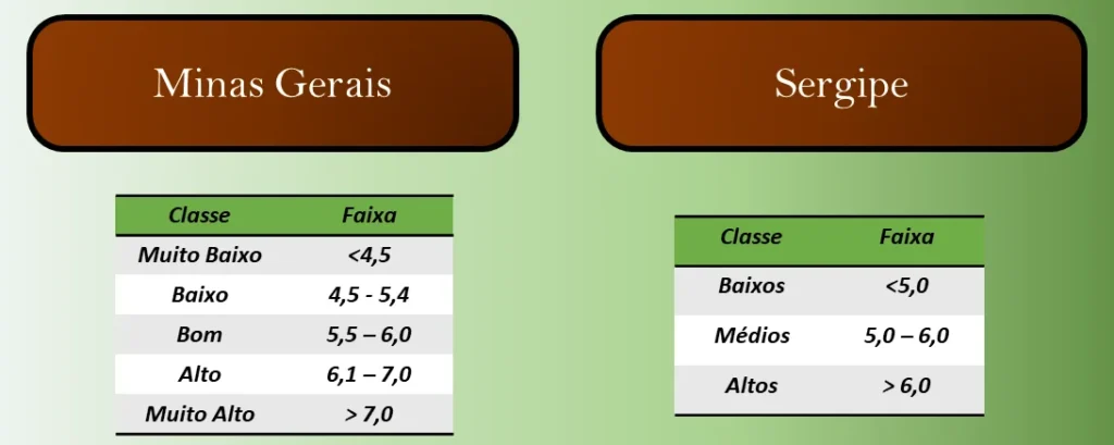 Já em interpretação de análises de solo, particularmente para fins de recomendação de calagem, gessagem e adubação, a classificação do pH do solo, ou muitas vezes da acidez do solo pode receber diferentes denominações, a depender do material de referência. Assim, por exemplo, a acidez do solo segundo o manual de Minas Gerais possui até 5 classes, enquanto no manual de Sergipe a acidez é dividida em 3 classes.