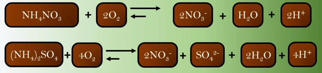 Íons NH4+, presentes inclusive na matéria orgânica do solo e em muitos fertilizantes minerais, estão sujeitos a processos de nitrificação que é caracterizada pela reação de oxidação do NH4+ produzindo NO3– e H+. Tal reação pode ocorrer, portanto, para fertilizantes tais como o nitrato de amônio e o sulfato de amônio.