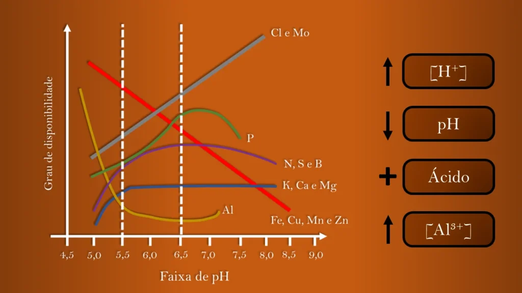 AA solubilidade do alumínio está intrinsecamente relacionada com à acidificação do solo, de tal forma que, uma maior atividade ou concentração de íons H+ que caracterize pH mais ácido, sobretudo para valores menores que 5,5 – 5,4, quando observado em um resultado de análise de solo são acompanhados de valores de Al3+ maiores que 0, expressando assim a atividade do Al3+ na solução do solo.